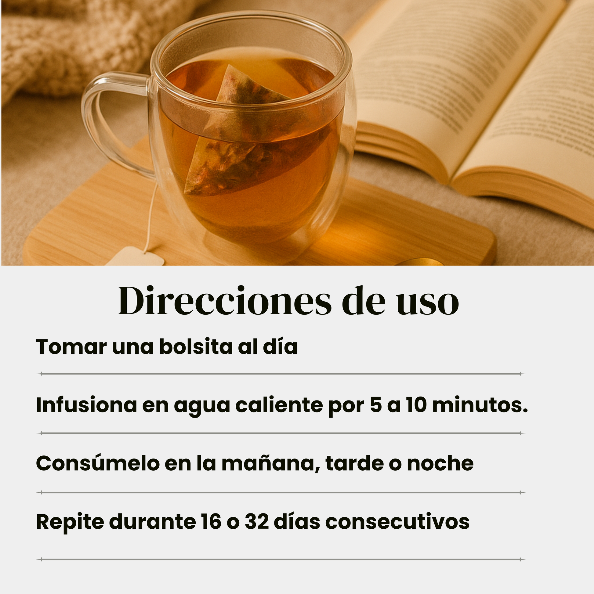Se recomienda tomar una taza al día, preferiblemente en la mañana o antes de dormir. Simplemente sumerge una bolsita en agua caliente por 3-5 minutos y disfruta. Es importante mantener la constancia durante los 16 días para obtener mejores resultados.